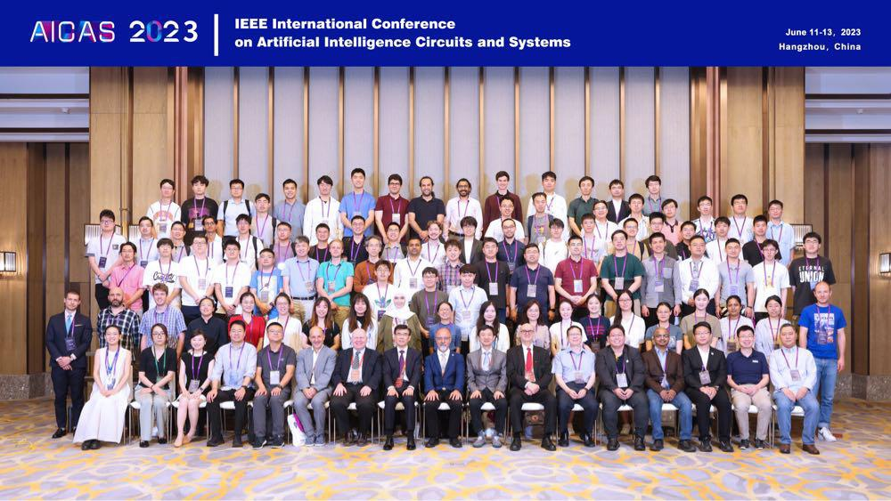 第五届人工智能电路与系统国际会议(AICAS 2023)于2023年6月11日至13日在杭州圆满举行。AICAS作为IEEE的旗舰会议,专注于AI硬件的实现、类脑计算和学习算法等领域,疫情之后首次在中国举办,吸引了来自中外的200多名学者和业界研究员参与。本次大会主席由国际智慧生物医疗器械领域科学家、加拿大皇家学会院士Mohamad Sawan和国际微电子学与固体电子学专家、国际欧亚科学院院士魏少军共同担任。坦佩雷大学Moncef Gabbouj院士以及北京大学杨玉超教授发表主旨演讲。重庆旋乐吧SPIN8智能科技公司技术总监钟正青博士受邀演示和分享了全场唯一一块65nm流片的类脑形态AI芯片DEMO演示系统。